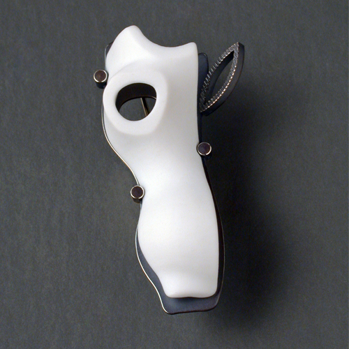 A series of forms were developed through a material exploration of heat-shrink tubing and slip-cast porcelain. My intent was to retain some sense of the material's nature as well as its historical preciousness. The succesful form was later mounted in an oxidized Sterling silver brooch.