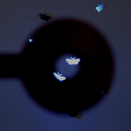 First exhibited in 2003, this artwork, entitled Night, noises in, 163, uses a free-standing viewing device and a column of suspended Scotchlite-covered moth shapes to attract and re(locate) the viewer. Like car headlights illuminating a jogger's safety clothing on a warm summer night, an ultrabright LED in the viewing device captures the moths in its 'gaze'.