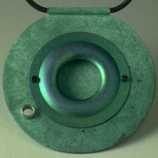Created in 1987, this piece, entitled Patina Pendant, juxtaposes a verdigris patina (literally "green of Greece") with Space Age anodised Niobium to give a sense of the historical continuum that contemporary metalsmiths travel when making their work.