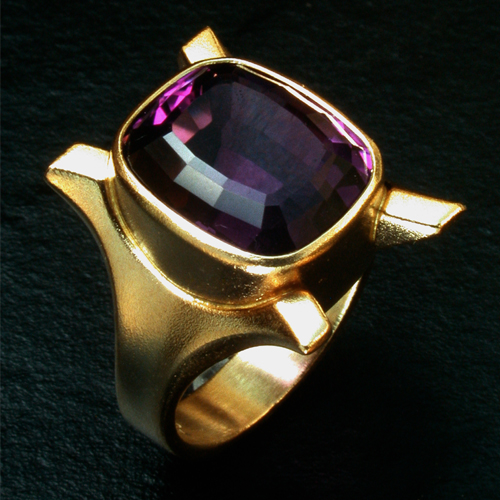 Created to commission in 1995, this 14kt cast yellow gold ring features a stunning eleven carat amethyst. Inspiration for this piece came from the client's name which, historically, is derived from the Ancient Egyptian Sh.sh.n. meaning "lotus blossom" and is pronounced Shushen. I used a stylization of the lotus capital employed in Ancient Egyptian architecture to support the gemstone.