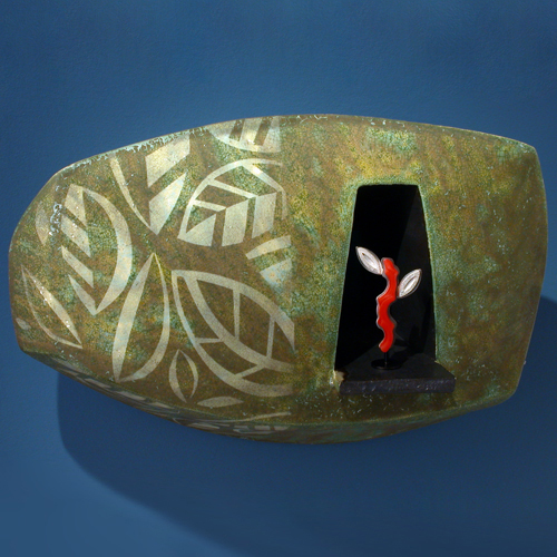 First exhibited in 2007 at the Thunder Bay Art Gallery in our collaborative exhibition, CONFLUENS: Flowing Together, this multi-fired ceramic wall-piece, entitled (Sylvan) Reliquary, features a removable Sterling silver and cast acrylic brooch. In the Middle Ages, red coral was used to ward off the distractions of devils. I would like to think that, in appearing to be like red coral, the acrylic form would benefit the viewer with the same prophylactic effect.