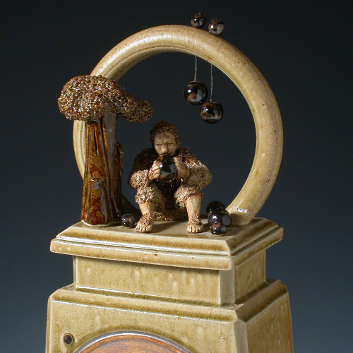 Created in 1982, this piece, entitled Man with Balls, features a lidded container that explores the negation of function and utility through more formal, controlled access. This artwork was exhibited in the BC Festival of the Arts, 1982.