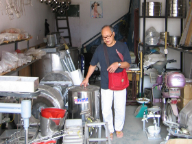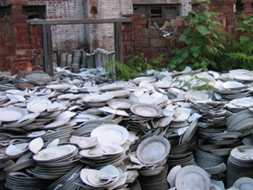"After our trip to China in the fall of 2005, we were eager to return to Jingdezhen for a month-long residency in order to explore the process of physical vapour deposition (PVD). While this process for the application of reflective metallic coatings exists in the West (think CDs and Oakley sunglasses), it would be highly unusual for a company to allow their space-suited technicians to place a ceramic artwork into their equipment. Not so in Jingdezhen, with equipment somewhat reminiscent of Doctor Frankenstein. With access to local mold-makers, press-molders, decal- and underglaze transfer-makers, slipcasters, glaze suppliers, kiln firers, box- and crate-makers, it seemed almost easy to return to Canada after a month with a half-cubic meter crate of works-in-progress to follow. With the excellent assistants and facilities at the JDZ PWS Experimental Factory, it was a very productive residency and our thanks go to the director, Takeshi Yasuda, and the entire crew at the PWS."