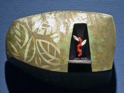 (r.) (sylvan) Reliquary: multi-fired ceramic with removable Sterl. and acrylic brooch. TEG/PWL, '07